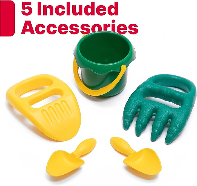 • SENSORY TABLE: 5-piece sand accessory set, shovel, rake, bucket, molded-in roadways on lid creates a race track, holds up to 80 lbs., sand not included