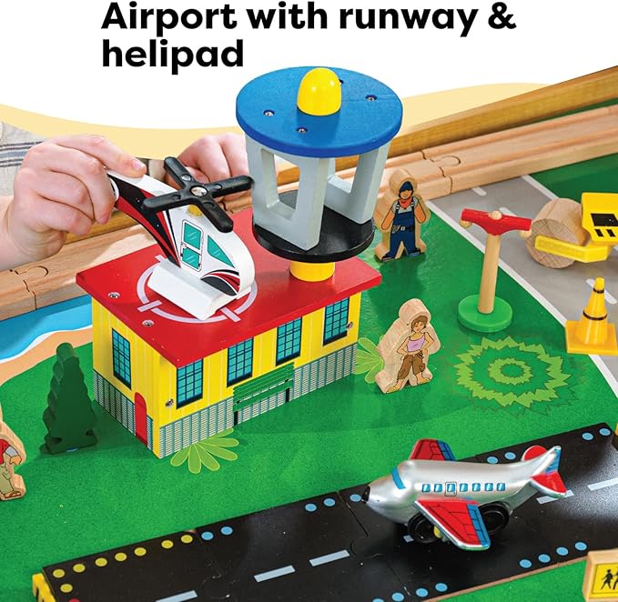 • MADE OF WOOD: Premium, sustainable materials are used to craft this train table. Colorful illustrated graphics adorn the tabletop. It includes train cars but is also compatible with other major wooden train brands so kids can mix and match favorites.