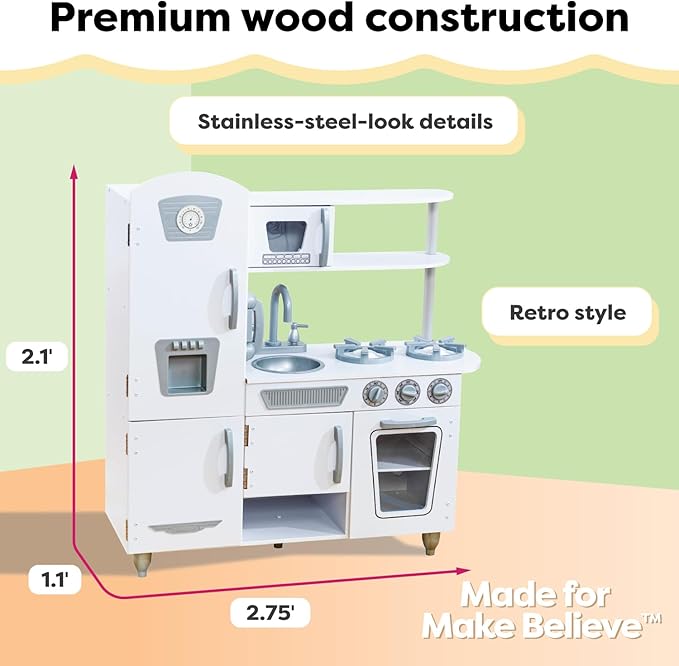 • HANDS-ON PLAY: Pick up the play phone and invite guests to dinner, press the ice maker, turn on the oven with the knobs that make a fun clicking sound—there's so much to do in this wooden play kitchen—just like the real thing.