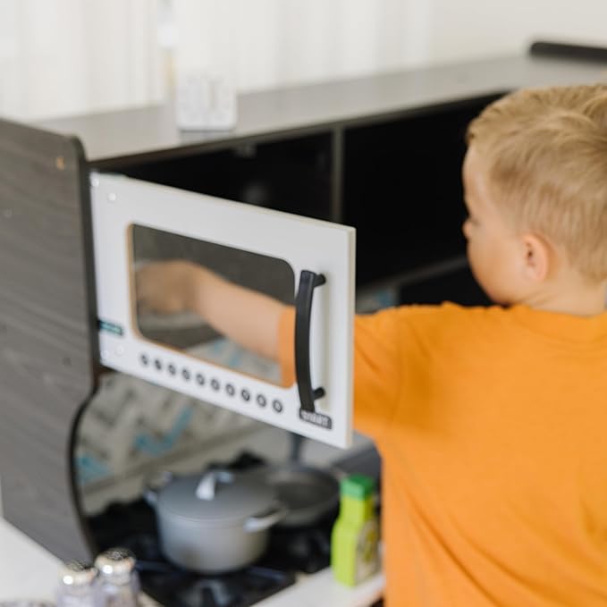 • EASY TO ASSEMBLE: Our toy kitchen with “ice” cube dispenser is roomy enough for multiple kids to play at once. This kids play kitchen is ideal for kitchen accessory play sets, pretend food collections, and play pantry products