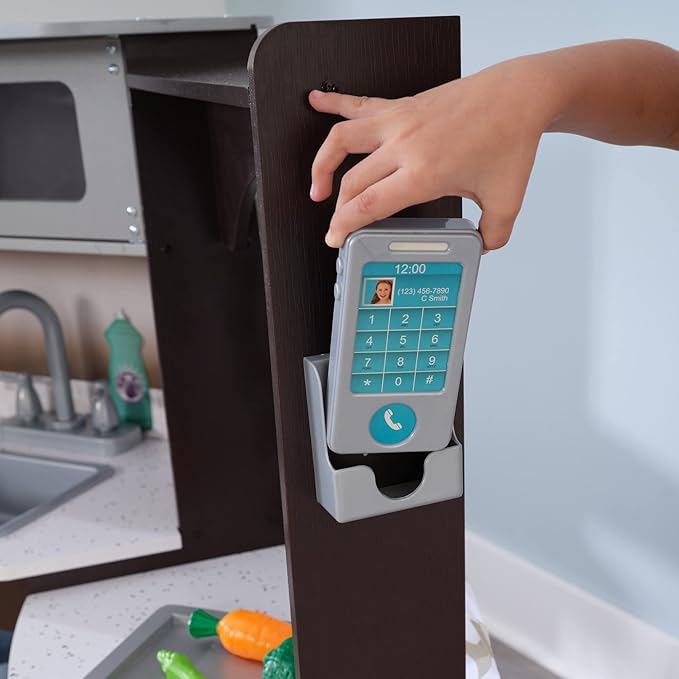 • SO DETAILED: Kids will find plenty of hands-on learning with buttons to press, knobs to turn and handles to pull. And, with homey touches like fabric curtains, a wall phone and lots of storage, this wooden kitchen is almost just like the real thing.