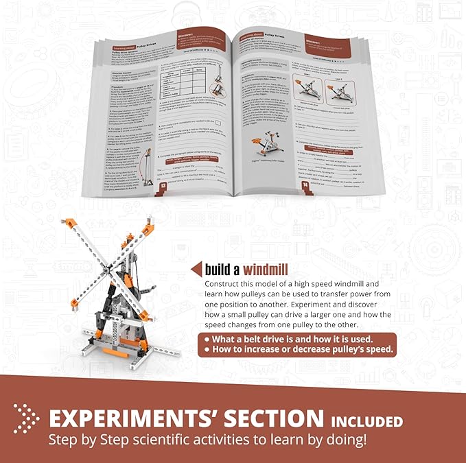 • EXPLORE PULLEYS: Kids discover the power of pulley drives with reduced friction, boosting force and speed! BUILD 8 working models like a material lift, a stationary bike, a construction crane and more.