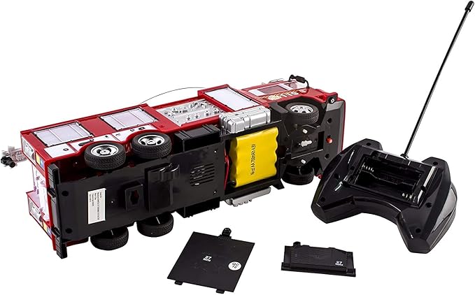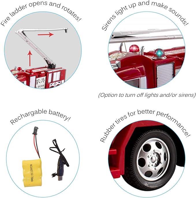 • PACKED WITH FUN: The RC firetruck is crafted with realistic features to enhance the fun. It features a ladder which opens and rotates, sirens that light up and make sounds (includes an option to turn off the lights and/or sirens), and rubber tires for a smooth ride.