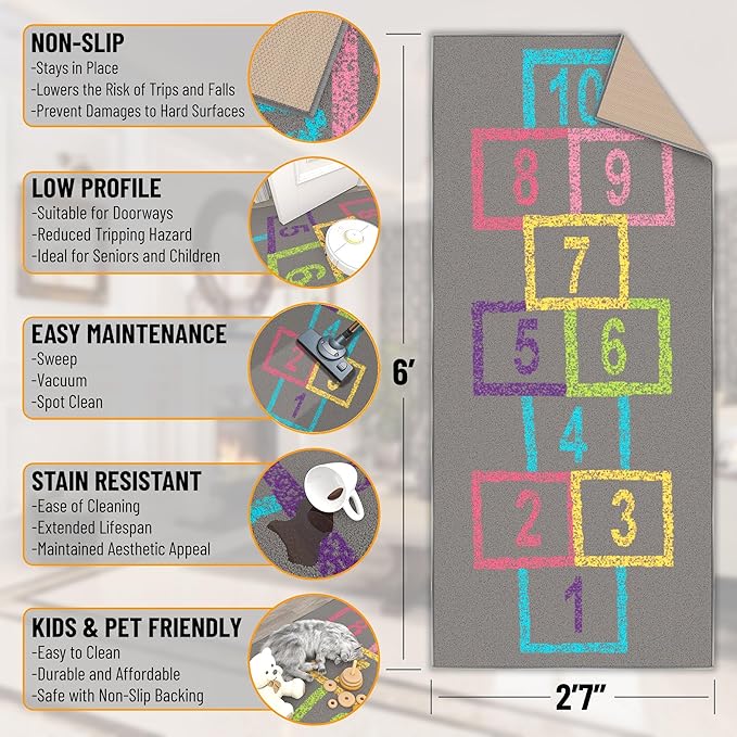 - [TRENDY STYLE]: This colorful kids rug features a hopscotch design children of all ages to enjoy while also adding color and enhancing the look of your home. Its timeless design can be integrated into a variety of home decor styles.
