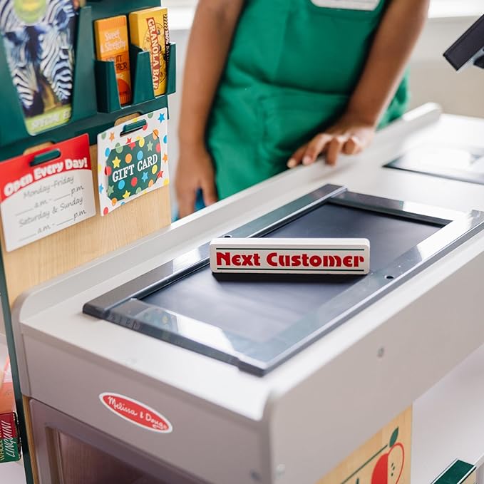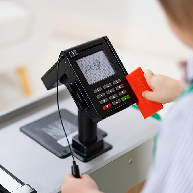 • Includes hand-cranked conveyor belt, beeping “scanner,” bagging area, card swipe machine, and cash drawer