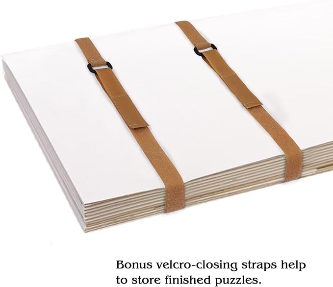 - Bonus 2 Storage Straps - 2 storage straps with velcro closures help to store finished puzzles. If you have more than several boards of puzzles, just stack the boards up and tighten them with the straps to prevent puzzles form breaking apart.