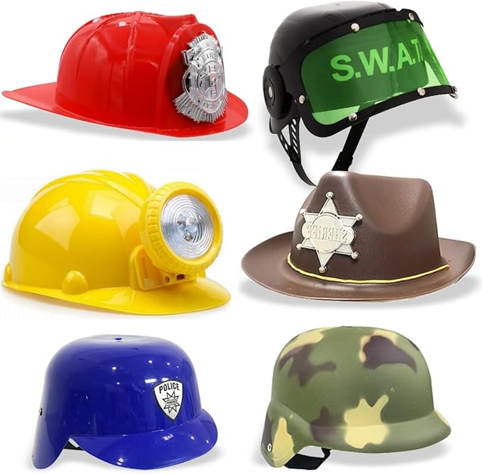 • Role Play Fun: Includes SWAT helmet, police helmet, camouflage army hat, fireman hat, miner hard hat with light, and cowboy hat with sheriff badge