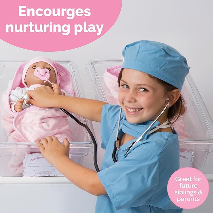• Complete 9-Piece Play Experience: Comes with a 16 inch baby doll, blanket, removable onesie, matching cap, pacifier, diaper, hospital bracelet, Certificate of Adoption, and box insert which doubles as a crib for pretend play.