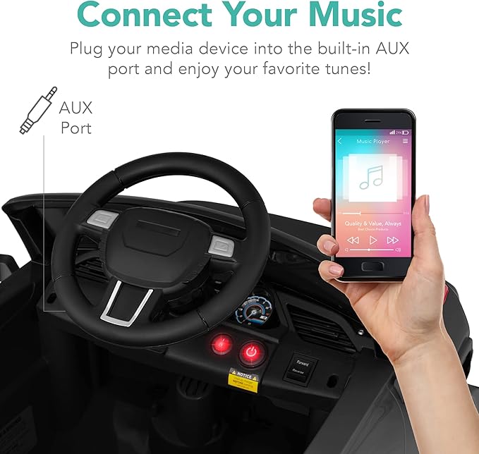 • CONNECT YOUR MUSIC: A built-in AUX outlet allows kids to plug in media devices to drive while jamming to their own selection of music