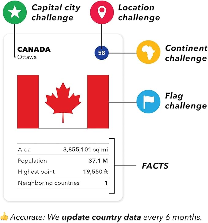 • Up-to-date Geography Game - An award-winning world learning card game. Can also be used as flash cards or trivia. Country's data is updated regularly.