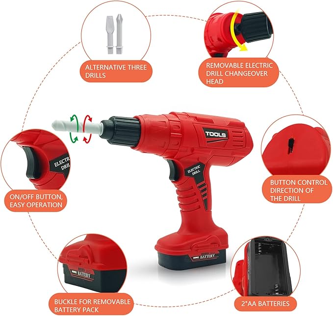 • ๐Ÿ”จใ€Toy Electric Drillใ€‘: Drill rotates clockwise/counterclockwise and makes realistic sounds. Comes with 3 interchangeable drill bits for kids to change as needed. This toy tool set can bring more fun to kids and develop their imagination.