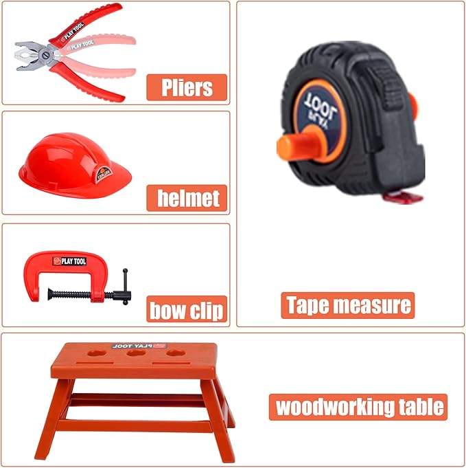 • โœใ€Construction Toysใ€‘: This kids tools set is not only a fun toy but also an educational learning tool. Comes with a helmet and tool bench, your child can dress up as a little builder to do carpentry, which helps activate young children's imagination, develop their brain and hands-on ability, enabling them to learn and develop life skills.