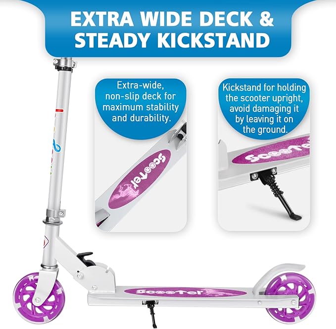 - Easy to Ride & Rest with Ease: The non-slip deck(Size: 12.2 *4 inches) is low-to-the-ground, making it easy for kids to hop on and off. 2 flashing wheels kick scooter comes with a kickstand to keep the scooter upright, without risking damage to the ends of your handlebars, take a relaxing break after having a fun ride.
