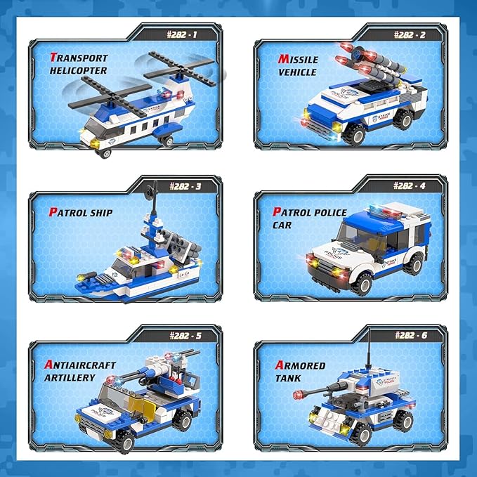 - COOL CITY POLICE PLAY SET: Kids can build transport helicopters, patrol ship, antiaircraft artillery, missile vehicle, police car, armored tank, military battleships, and rescues helicopters with these more than 1169 pieces of building bricks, This will give kids bring exciting ocean military battle adventures