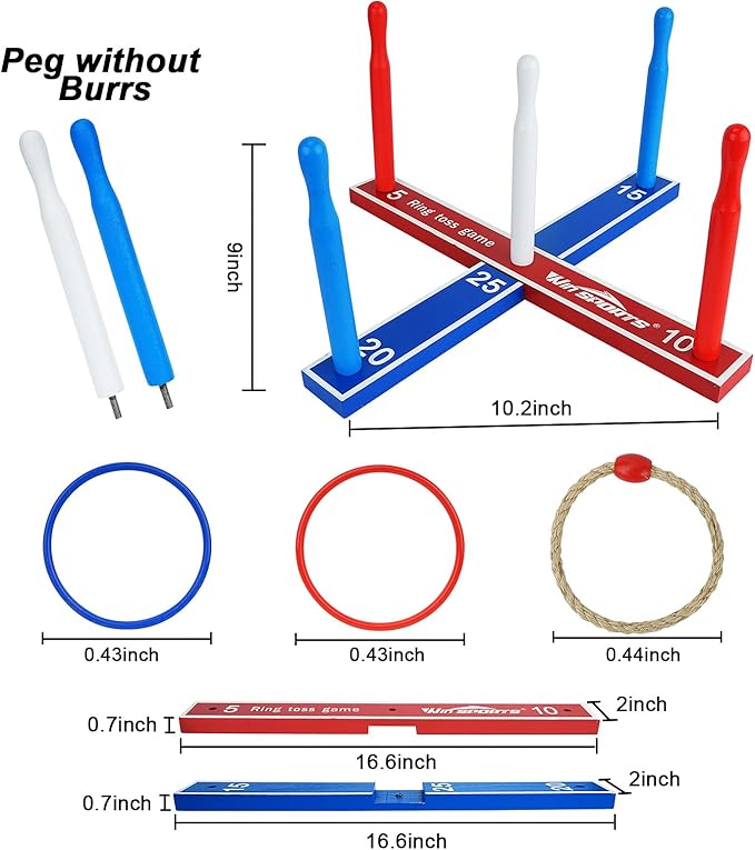 - ★Wooden Ring Toss Game Set : The traditional kids toy that will never grow old. This set includes a sturdy wood base with point markings screw in pegs, 8 rope rings, 8 plastic rings (4 red and 4 blue of each) ,instruction &rules and a convenient carry storage bag.