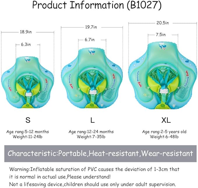 - 【Suitable Crowd】Our Inflatable Baby Float is suitable for the age 6- 36 months baby, and it can support baby with 11-35lb. please refer to our product picture in the third picture with the dimension, Or you can also contact us, we will recommend the size for your baby.