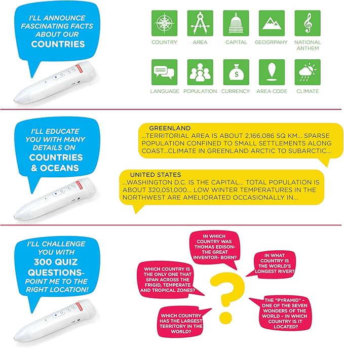 - INTERACTIVE SMART PEN ๐บ๏ธ: Girls and boys can use the smart pen to touch countries and locations on the globe and get information in real-time via voice recordings played through the small, built-in speaker, offering hours of early learning fun.