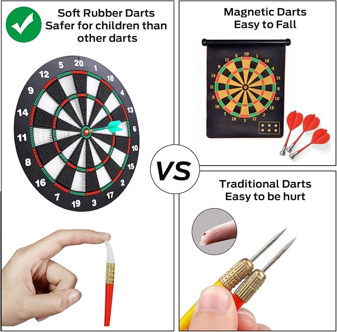 • Safety Dart Board Set: Our dart board set with 6Pcs safety soft rubber tip darts are safer than traditional steel tip darts, eliminate any dangers associated with sharp points, and enjoy the fun of all the same characteristics of traditional dartboard, but no worry about the walls or any hurt getting.