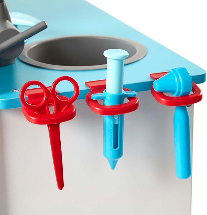 • Includes blood pressure monitor with adjustable cuff, 2 X-rays to display, scale with movable weight, adjustable height bar, eye chart, clock with movable hands, movable tool hooks and holders, sink, sanitizer pump, reversible diploma/window card