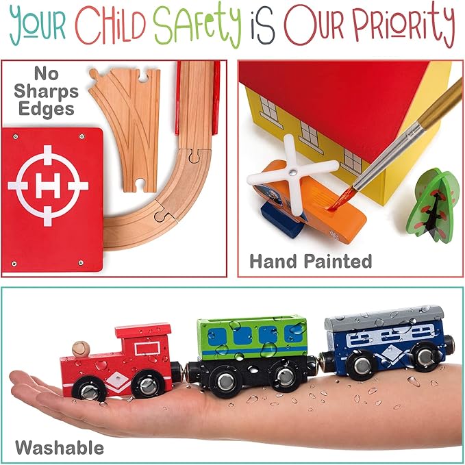 - ๐ PERFECT SET FOR TRAIN LOVERS โ 31 wood train tracks that easily connect, 3 magnetic trains to conduct, a helicopter to fly and 3 cars to drive, an airport playset, a bus station and more. There are even 3 fish and a fishing rod! this wood train set for toddlers has everything a boy or girl needs to be creative.