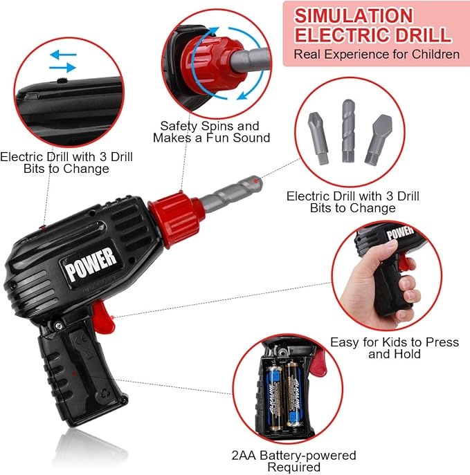 - POWER TOOLS TOY DRILL SET WITH REALISTIC DRILLING SOUNDS AND MOTION: Realistic-looking mini plastic toy electric drill comes with 3 interchangeable drill bits for different function only requires 2AA batteries that simulate sound and movements, which is more attractive and develop kids’ imagination.