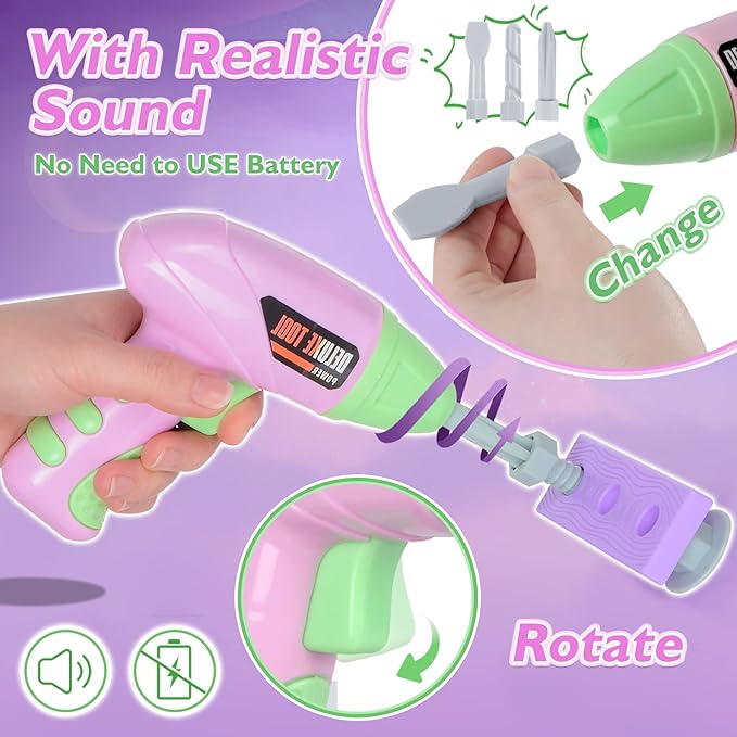 Kids Tool Set - Toddler Tool Playset with Toy Drill, Toy Tool Box, Construction Tools - Pretend Play Toddler Girl Toys Gifts for Toddlers Kids Aged 3 4 5 6 (Pink Tools)