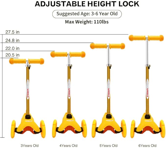 - Adjustable Handlebar Height: Our kids scooters with adjustable height aluminum alloy handlebar can be adjusted from 20.5 to 27.5 inches, with a max weight of 110lbs, great for 3-6 years children.
