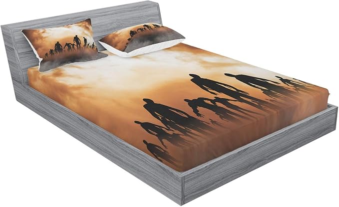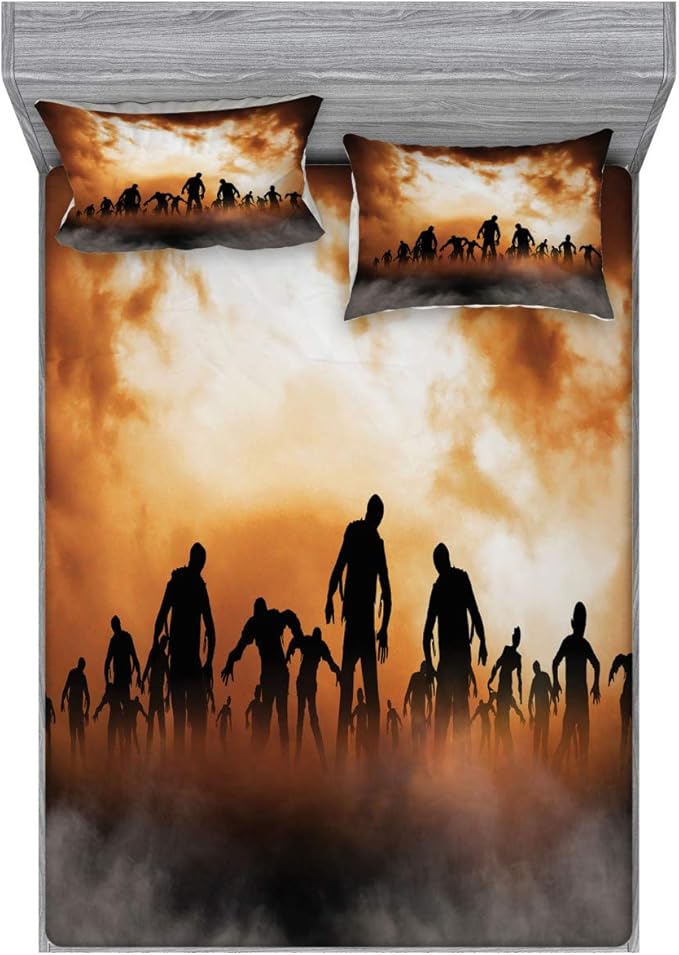 Ambesonne Halloween Home Decor Fitted Sheet & Pillow Sham Set Zombies Dead Men Walking Body in The Doom Mist at Night Sky Haunted 3 Piece Bedding Decor Set for Bedroom Decor Queen, Orange and Black