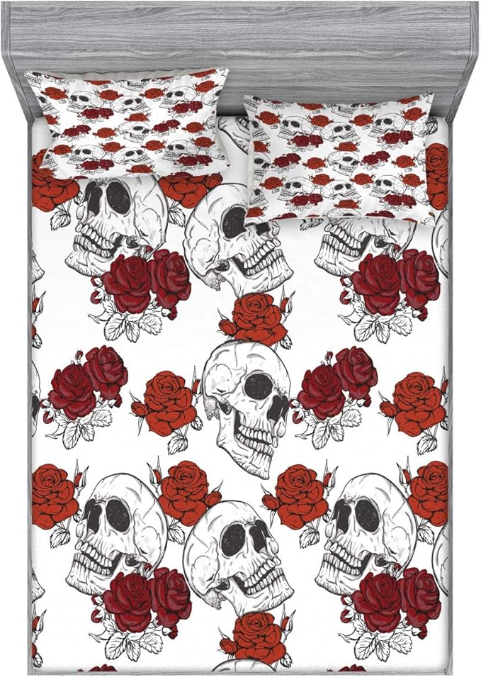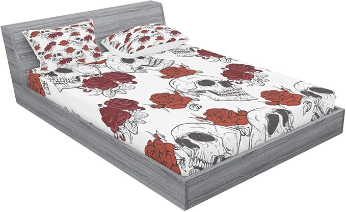Ambesonne Skull Fitted Sheet & Pillow Sham Set, Retro Gothic Dead Head Skeleton with Roses Halloween Theme Spooky Trippy Romantic, Decorative Printed 3 Piece Bedding Decor Set, Full, Grey