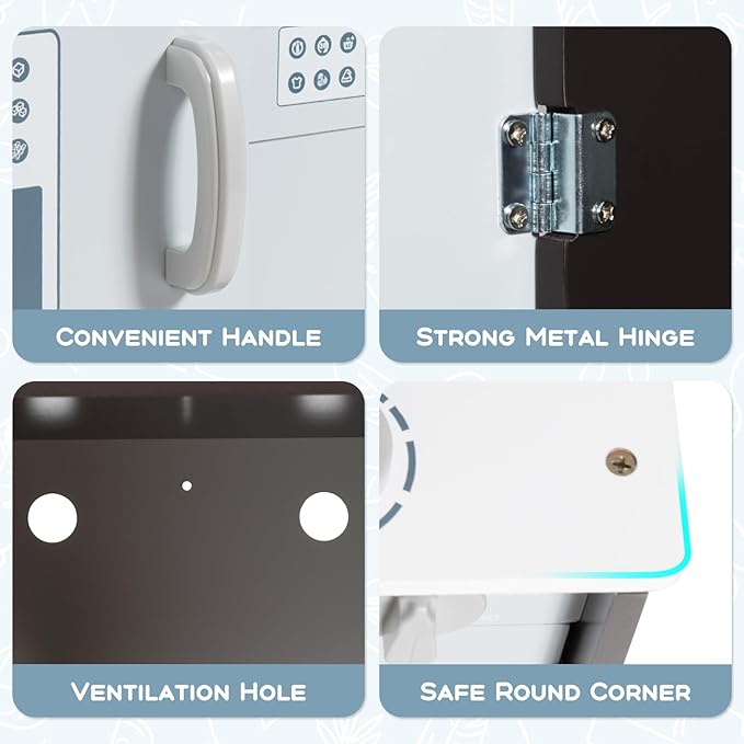 - 【Large Storage Space】Open the door under the sink and stove to storage as many food as possible. Besides, there is also the space aside the microwave to hold added food or cookware, which can exercise children’s classification and organization ability. . With so much storage space, kids won't mess up the kitchen playset during the entertainment.