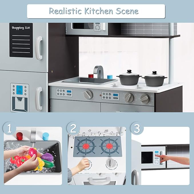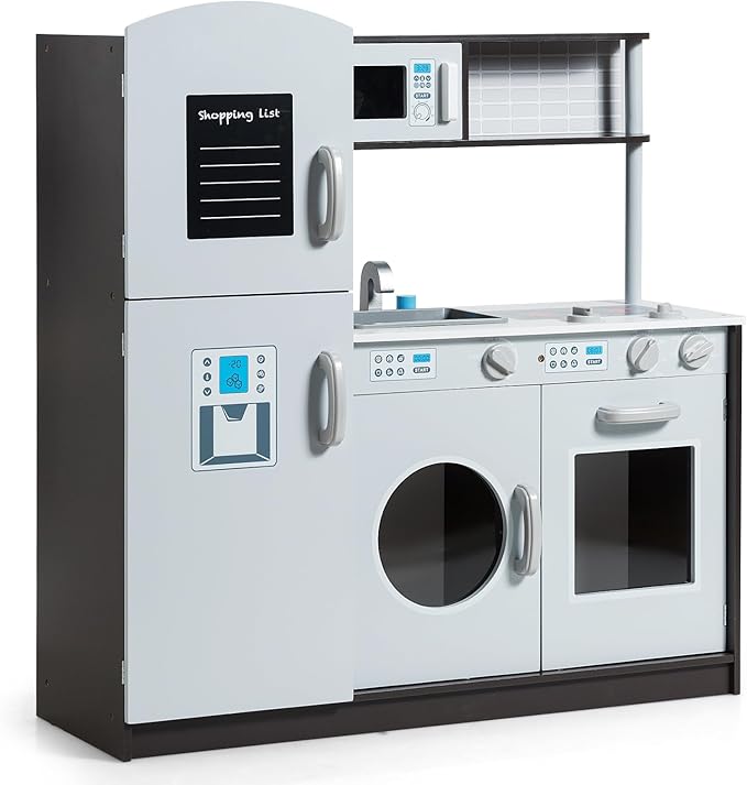 - 【Selected Premium Material】 Constructed by solid MDF, Costzon kids kitchen playset is durable and stable for your children to play. Plaint in child-friendly paint which is odorless so that your kids can play it freely. They can play like a master chef for years of wear and tear.
