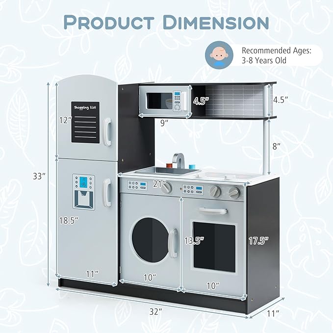- 【Certified Playset & Wide Application】ASTM and CPSIA certification means this kitchen set is a safe yet exciting for any child to join in on the fun. Weighing 27.5lbs. & measuring 32"L x 11"W x 33"H, f the freestanding pretend play kitchen is perfect for playroom, bedroom, daycare, school classroom.