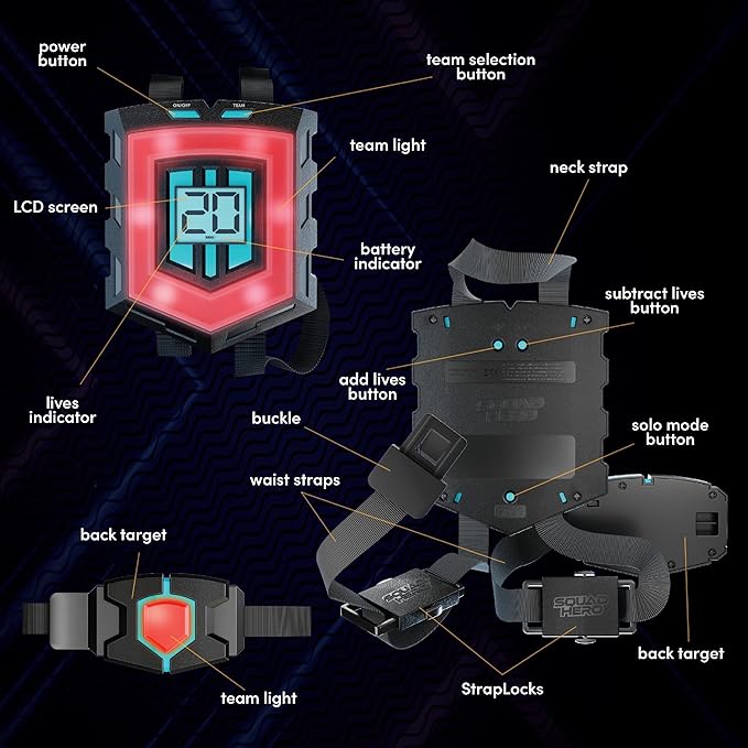 - 360° Combat: 3 target zones (chest, back, and the gun) gives your opponent no escape. Herosync & LCD HUD technologies – Trying to remember the score is never fun, so your guns and vests pair together! Lives and team data are automatically synced, and LCDs on the vests and guns allow you to check your status, even in the heat of battle – without having to rely on lights or audio.