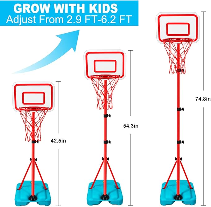 - ๐ Height Adjustable: The height of the basket ball hoop can be adjusted from 2.8 ft -6.2 ft. Basketball game is fun and exciting for kids all ages. Perfect basketball hoop for toddlers 1-3 3-5 or kids basketball goal ages 4-8. Wonderful birthday present for 3 4 5 year old boys girls.