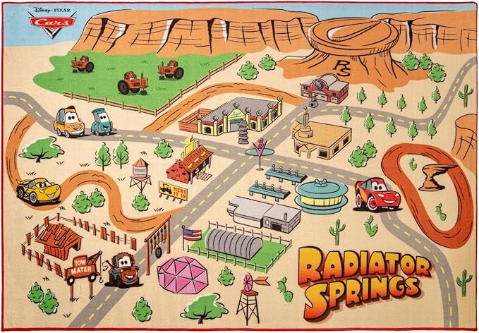 Gertmenian Disney Pixar Cars Indoor Game Rug - 4x6 Large, Non-Slip, Ideal for Children in Bedroom, Game Room, Classroom, Nursery, or Play Area - Radiator Springs Playmat, Multi/Tan, 31201