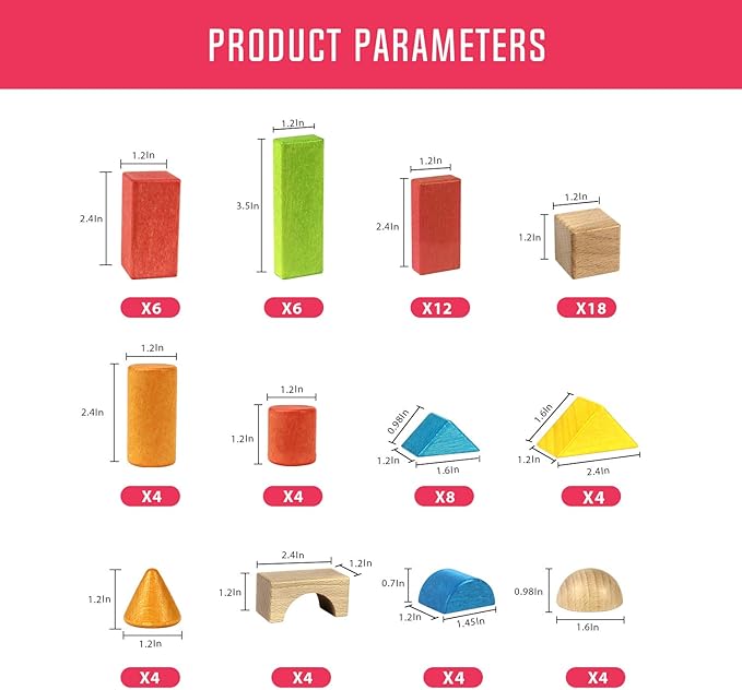 - Building Blocks Set : Bring the magic of building toys to your child's playtime with the Wooden Building Blocks Set! With 80 wooden blocks in different colors and shapes, your toddler can let their imagination run wild as they create and build their own masterpieces, with a bonus storage bag, making it easy to keep the blocks organized and portable for on-the-go playtime.