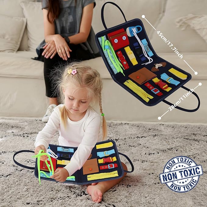 • [15-IN-1 TODDLER BUSY BOARD]: This busy board for toddlers features 14 different varieties of buttons, zip pocket, lace and etc, with a set of hook&loop alphabet and 1 2 3 letters(35 PCS). Designed in varying difficulty levels to be challenging but not too much to keep your toddlers interested.
