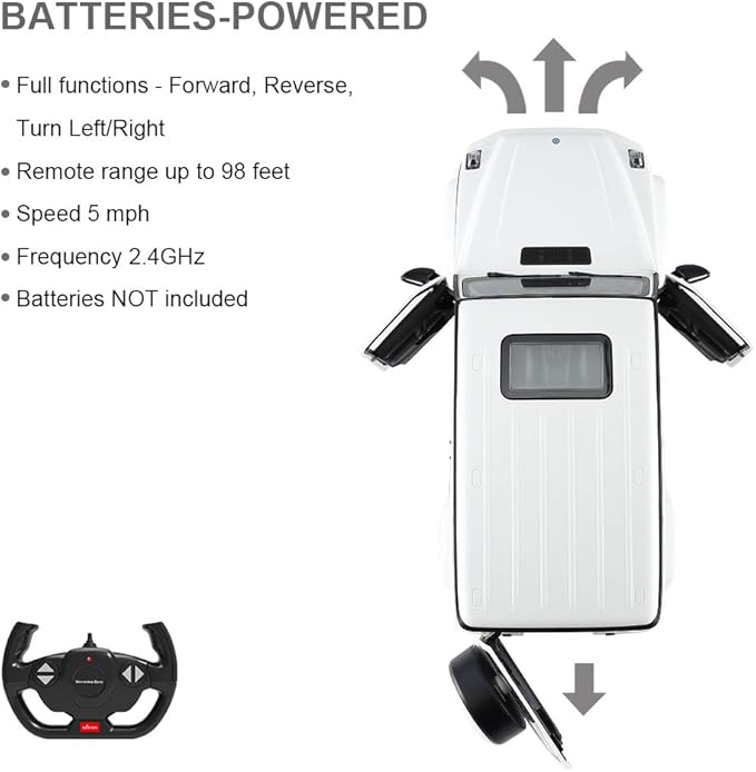 • BATTERIES POWERED, NOT INCLUDED - Requires 5AA for the vehicle and 2AA for the remote; this Mercedes-AMG G63 rc car needs a smooth surface like concrete, wood or asphalt though, no carpet.