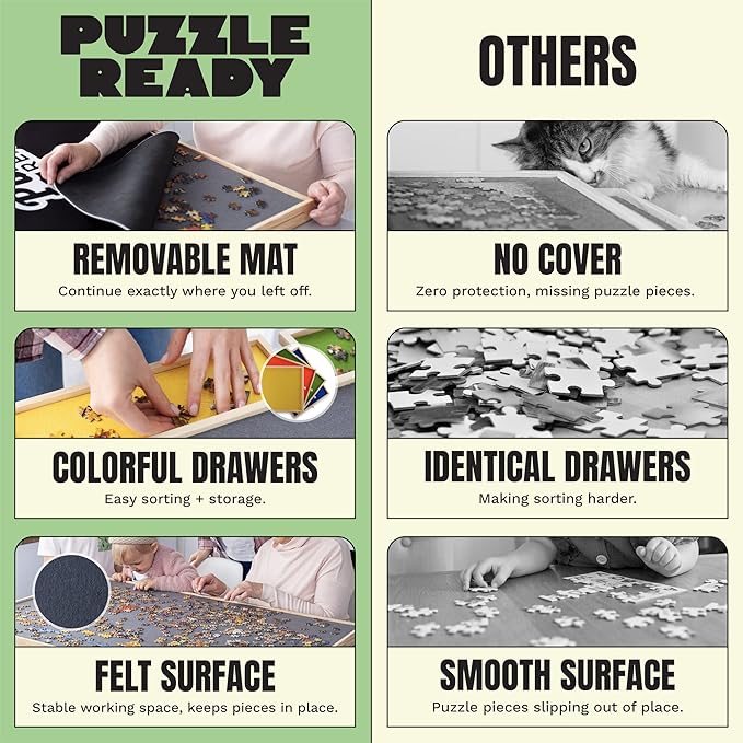 - Perfect For Puzzle Enthusiasts: This versatile puzzle table with drawers is the all-in-one solution you've been searching for. With sliding drawers for sorting, a removable jigsaw puzzle mat for protection, and no-slip feet, your living room table stays scratch-free. It's a game-changer for puzzle lovers