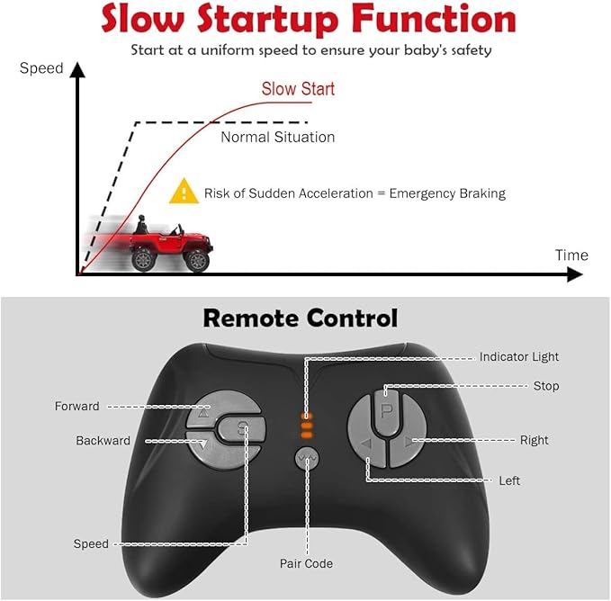 - 【Security Assurance】 The kids car is equipped with a slow start function to avoid the risk of sudden acceleration. Besides, 4 wear-resistant wheels is made of superior PP material without leaking or tire burst. Its spring suspension system and seat with multi-point safety belt offer safer driving experience.