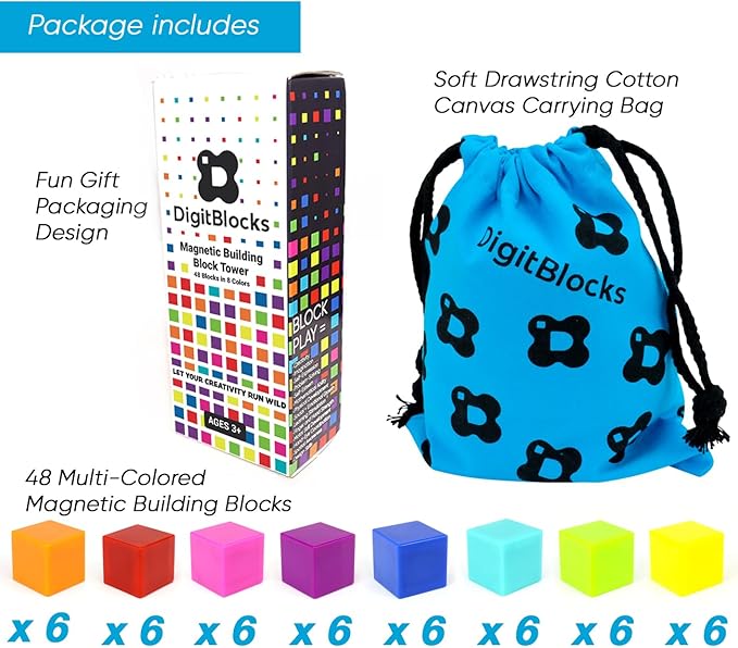 • 48PCS Magnetic Building Blocks: Vibrant & Durable: Includes 48 multi-colored magnetic cubes in 8 bright colors, a soft cotton storage bag, and a 10-page idea booklet. Crafted from non-toxic ABS plastic with strong magnets for safe and long-lasting play.