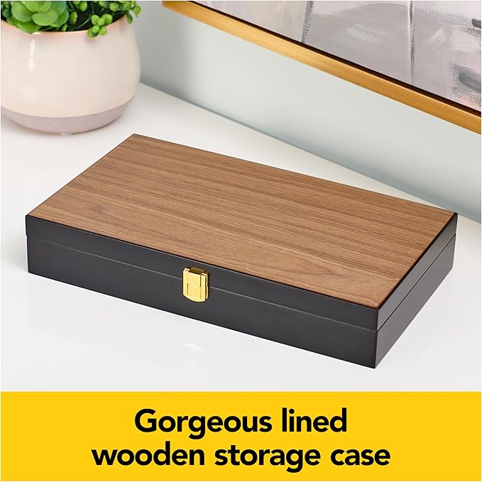 - TWO-TONE TILES & LINED WOOD CASE: With just the right amount of heft and a smooth feel, these quality tiles make game night a special occasion. The lined, hinged wood case safely stores the tiles and components, making it easy to take anywhere.