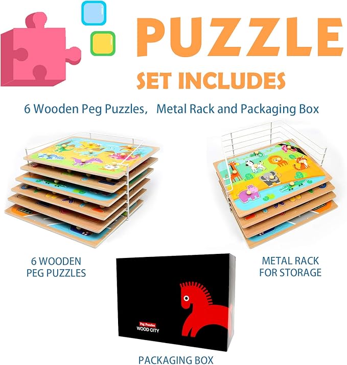 - ๐งฉTODDLER PUZZLES WITH STORAGE RACK: WOOD CITY Peg Puzzle Sets includes 6 pack wooden puzzles of different themes as well as a puzzle shelf to keep the wood puzzles within easy reach and maintain your playroom tidy by this metal puzzle rack.