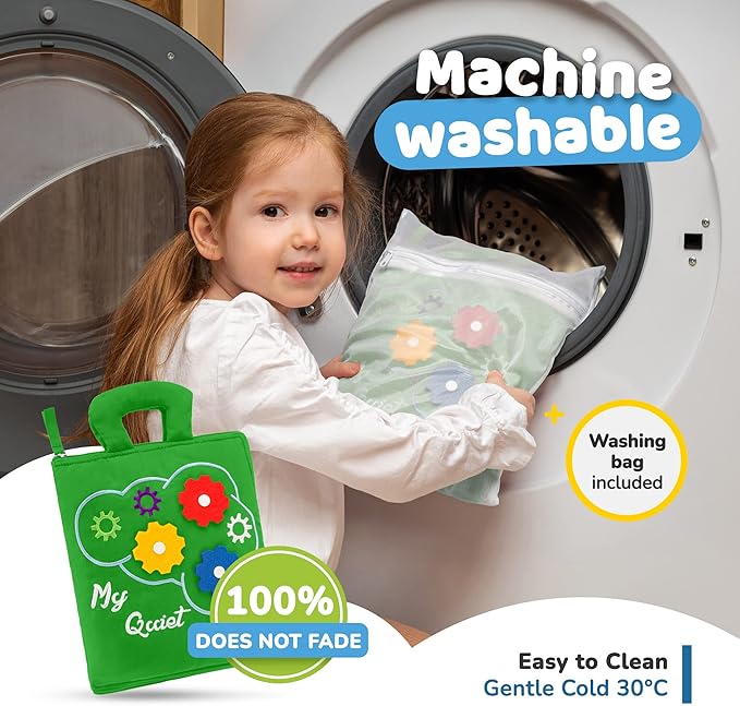 - Busy Board Book for Fine Motor Skills – This montessori toy for toddlers features 9 engaging activities designed to develop fine motor skills, including matching velcro shapes and colors, practicing buckles, telling time, and more. A fun and educational montessori busy board for 1 year old and up, it helps kids learn real-life skills through hands-on play.