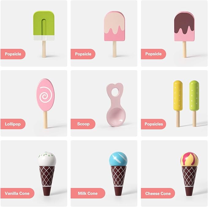 • CUTE & EDUCATIONAL: ROBUD Wooden Ice Cream Toys is design to Promote Language and encourages imaginative play, Including Pretend Ice cream, Ice cream cones, Ice Cream Truck.