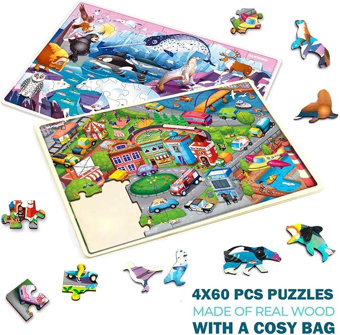 QUOKKA Wooden Puzzles for Kids Ages 4-6 – 4 x 60 Piece Kids Puzzles Ages 4-8-10 Year Olds by QUOKKA - Jigsaw Learning Game with Animals Dinosaurs City for 3-5 yo Wood Toys for Boys and Girls