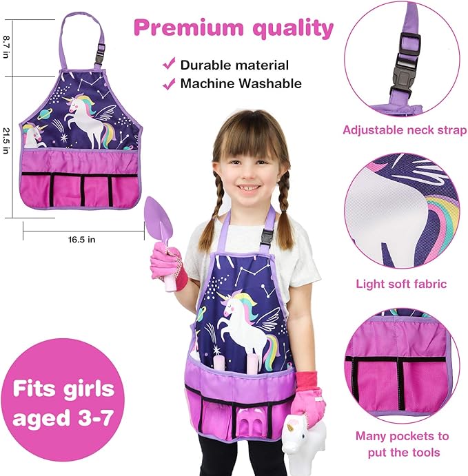 • Kids Gardening Tools Included - Unicorn Apron, Unicorn Watering Can, Gardening Rake, Spade, Shovel and Gloves. Everything they need for gardening! But, with our unicorn theme