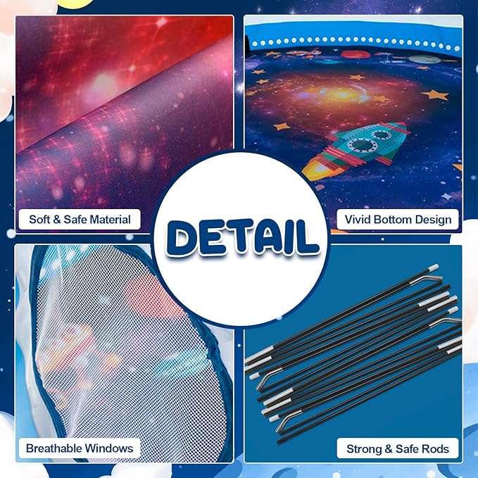 - ★Space Theme★ The space theme rocket ship playhouse for kids is well fit for kids who have interest in shining stars, far outspace, rotational planets, traveling meteorites, the rockets, the astronaut, the spaceship, the space station... It is really a good rocket toy. An adventure of great fun is waiting for them. You know how excited when they see this creative space toys.