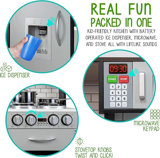 - SUPER REALISTIC SIGHTS & SOUNDS | Much More Than a Toy, Our Interactive Design Enables Meaningful STEM Learning as Boys & Girls Immerse Themselves in a Real Kitchen Setup | Elements Include Battery-Operated Ice Dispenser, Microwave with Buttons & Sounds, Clicking Knobs & More