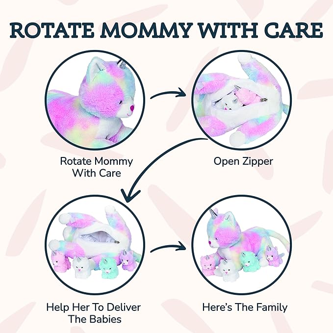 • FIVE SURPRISE STUFFED TOYS: Uncover the enchantment of discovering four darling baby kittycorns nestled inside our mommy unicorn cat plushie; perfect toys for girls age 7 who love surprises; unzip mommy's tummy for a delightful surprise